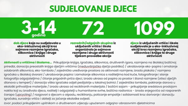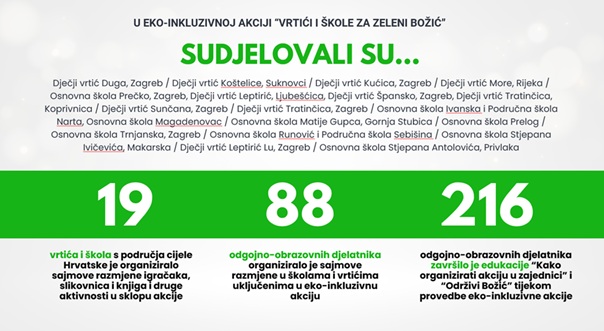 Iz izvještaja o provedbi eko-inkluzivne akcije u vrtićima i školama, koja je održana tijekom božićnog razdoblja i koja predstavlja prvu fazu podrške korisnicima Udruge za promicanje inkluzije, možete vidjeti obuhvat samo jedne akcije, gdje će o akciji biti informirano gotovo 3K+ roditelja uključene djece te odgojno-obrazovnih djelatnika, a putem društvenih mreža Zelenog klika! dodatnih 3K+ pratitelja naših programa.